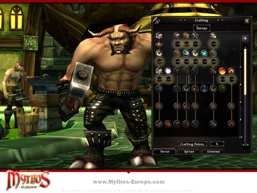 Eines der zentralen Features des beliebten Hack´n´Slay MMOs Mythos ist das umfangreiche Crafting-System. Damit können die Spieler Gegenstände, die sie in den gefährlichen Dungeons gefunden oder von grausigen Monstern erbeutet haben, zerlegen und mächtigere Items erschaffen. Dabei stehen ihnen insgesamt drei Spezialisierungen zur Verfügung: "Terran", "Sylvan" und "Ethereal". Durch zusätzliches Aufwerten und eine gezielte Vergabe von Skill-Punkten können die mächtigsten Items des Spiels hergestellt werden.In jedem der drei Skill-Typen gibt es Spezialisierungen für Waffen- und Rüstungsteile unterschiedlichster Art. Die "Terran"-Items sind z.B. Schwerter oder Brust-Rüstungsteile. In der Kategorie "Ethereal" gibt es die Möglichkeit magische Gegenstände wie Zauberstäbe oder Gewänder herzustellen. Schusswaffen können mit "Sylvan" gefertigt werden. Außerdem besitzt jede Kategorie sechs verschiedene Zauber, mit denen die Items aufgewertet werden können, beispielsweise Feuerschaden oder Giftschutz.
