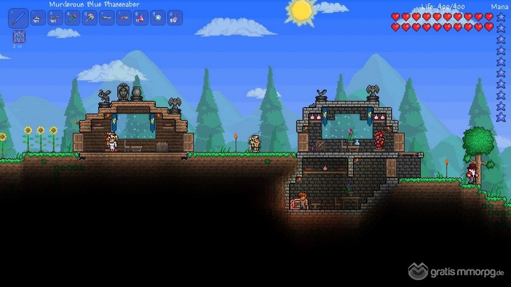 Terraria ist kein wirkliches MMORPG, sondern ein Sandbox-Spiel im Retro-Look, eine 2D-Plattform mit Pixelgrafiken für unsere jungen Leser. Es hatte bereits großen Erfolg auf dem PC-Markt. Die komplette Karte wird generiert, wenn man das erste Mal eine Welt betritt; es ist also eine riesige, aber begrenzte Welt, wodurch das Spiel die ganze Zeit flüssig läuft. Es dreht sich alles um Erkundung, das Sammeln von Materialen und den Bau eines Unterschlupfes und Ausrüstung, oder wonach euch immer sein mag. Auch böse, starke Bosse, die in der Welt verteilt vorkommen, müssen besiegt werden.